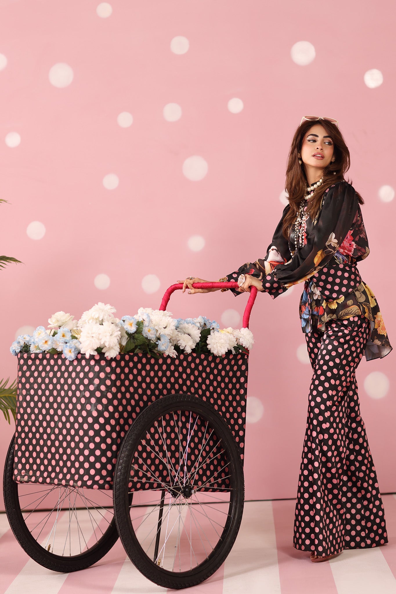 The Geometric Canvas: A high-octane pink-on-black polka dot foundation that serves as a sharp, graphic anchor for the overall editorial aesthetic.
