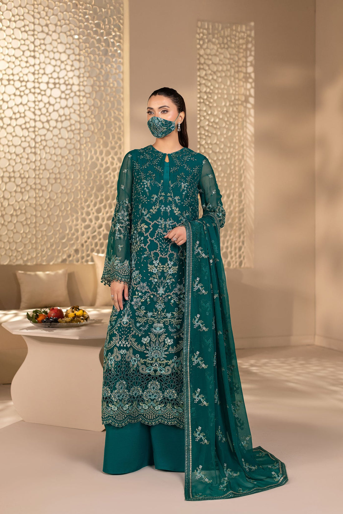 Elevate your wardrobe with this stunning embroidered ensemble that celebrates traditional craftsmanship. Featuring an intricately...