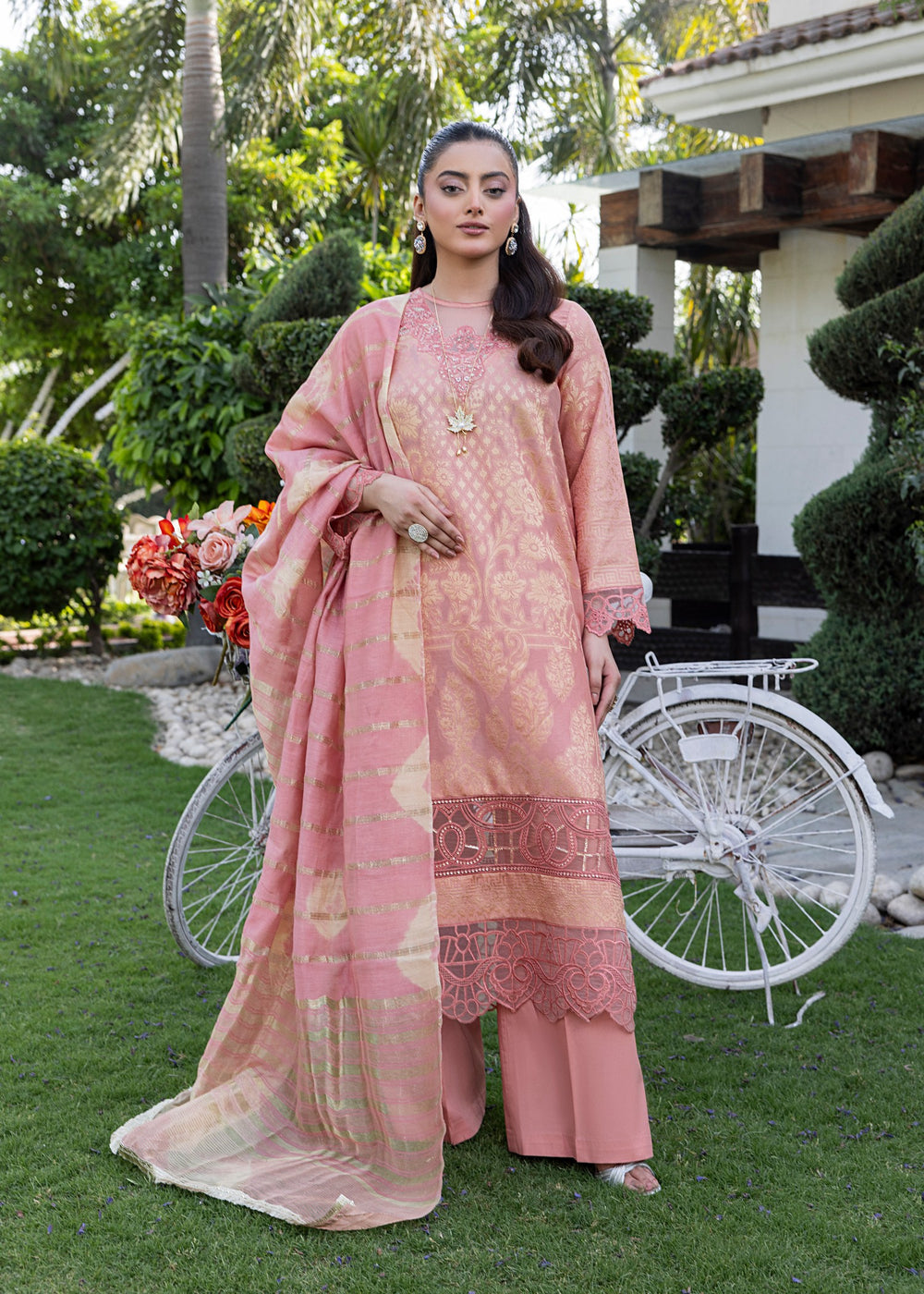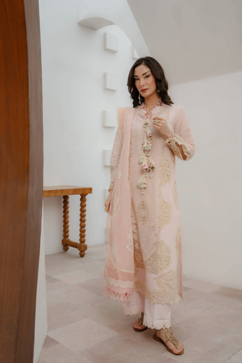 Cherry Blossom is an exquisitely draped tea pink lawn 3-piece pret silhouette showcasing a beautifully...