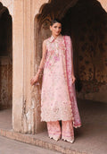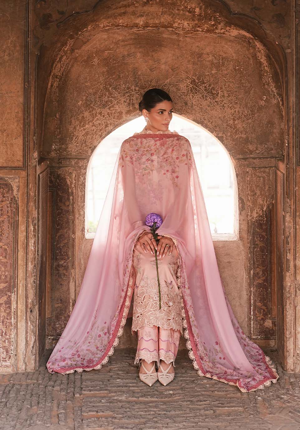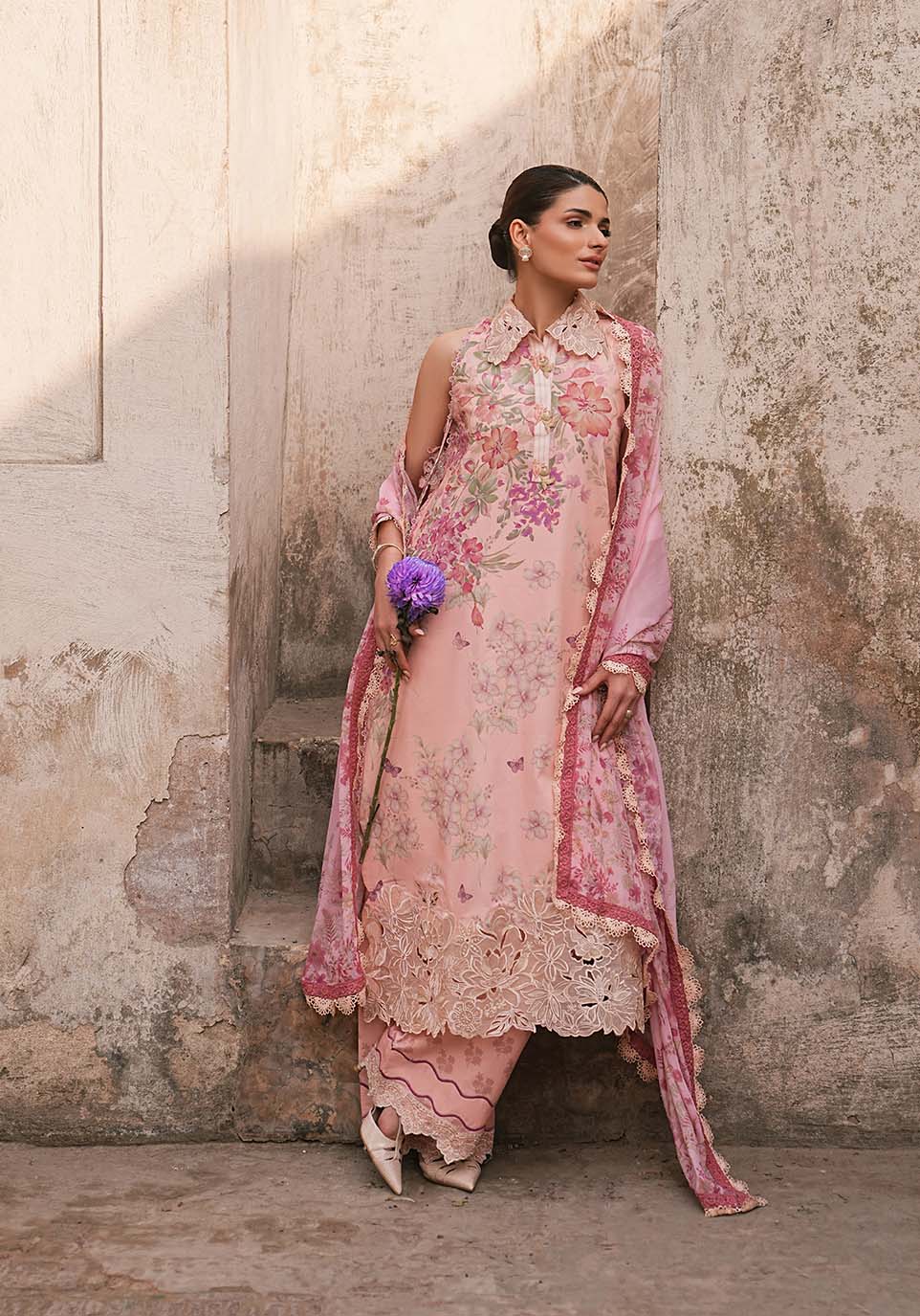 Soft blush. Intricate detail. Effortless grace. A delicate expression of summer elegance in soft blush hues. Crafted in breathable airy lawn and defined by intricate Schiffli embroidery, the silhouette carries quiet structure without heaviness. A fluid silk dupatta, washed in softened florals, drapes with natural ease — balancing delicacy with intention.
